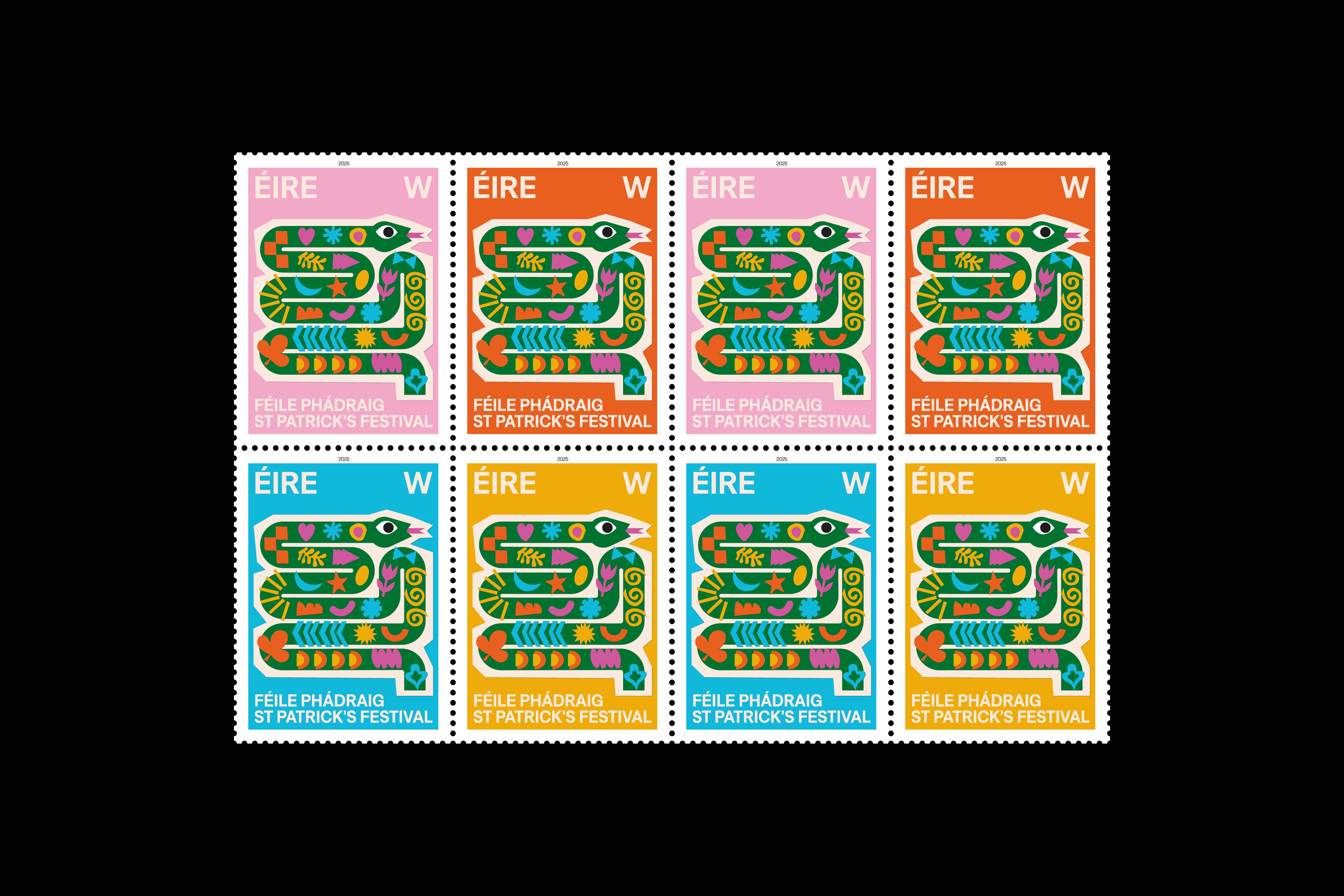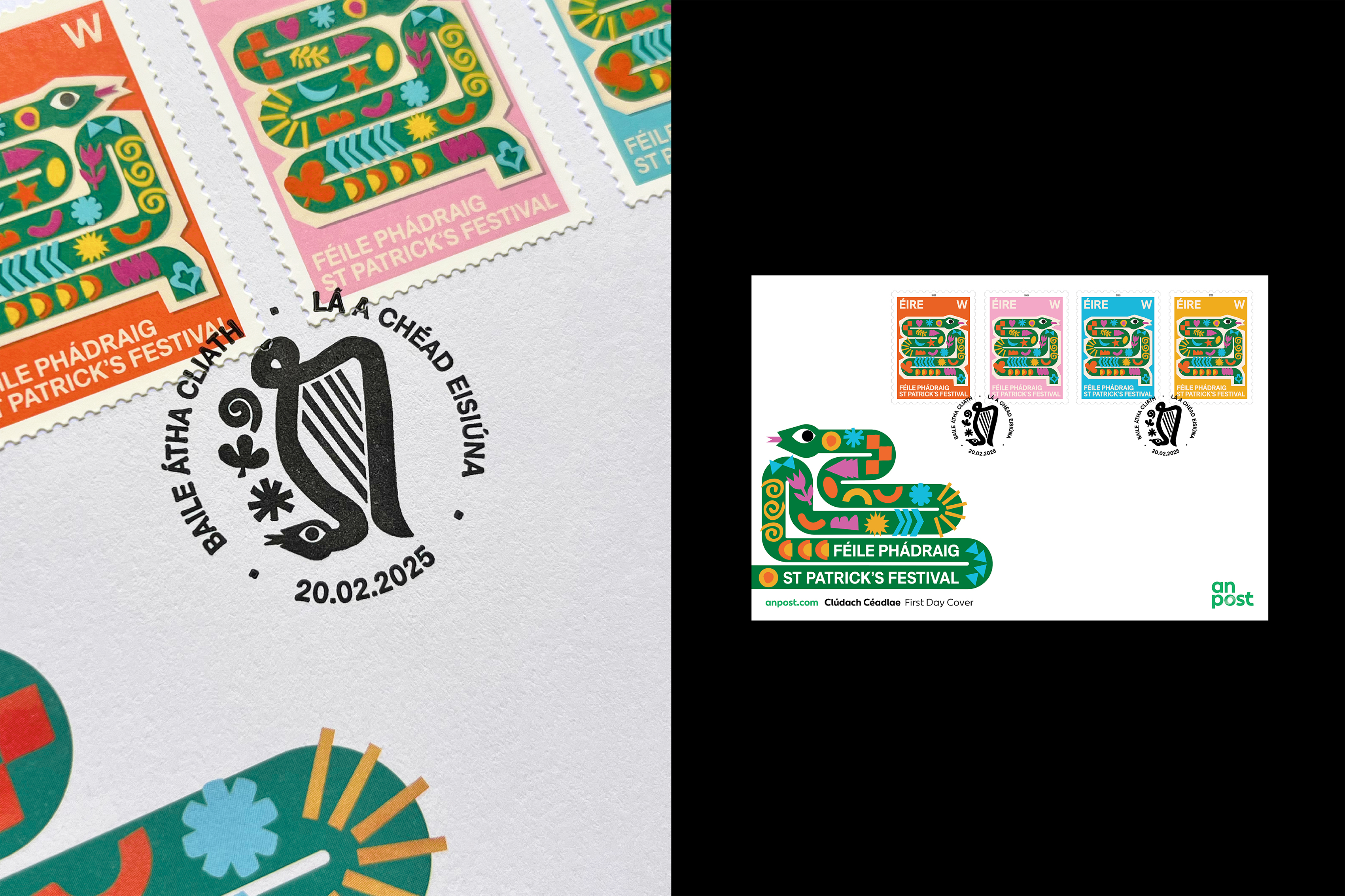 To celebrate St. Patrick’s Day Festival 2025, An Post commissioned us to design a stamp capturing the vibrant spirit of the three-day celebration. Since Paddy’s old nemesis has ironically become the de facto symbol of the festival, we embraced the theme—drawing inspiration from paper craft and the classic Nokia game. The result? A lively, colourful serpent embodying the festival’s energy, from music and dance to culture and the all-important parade.
