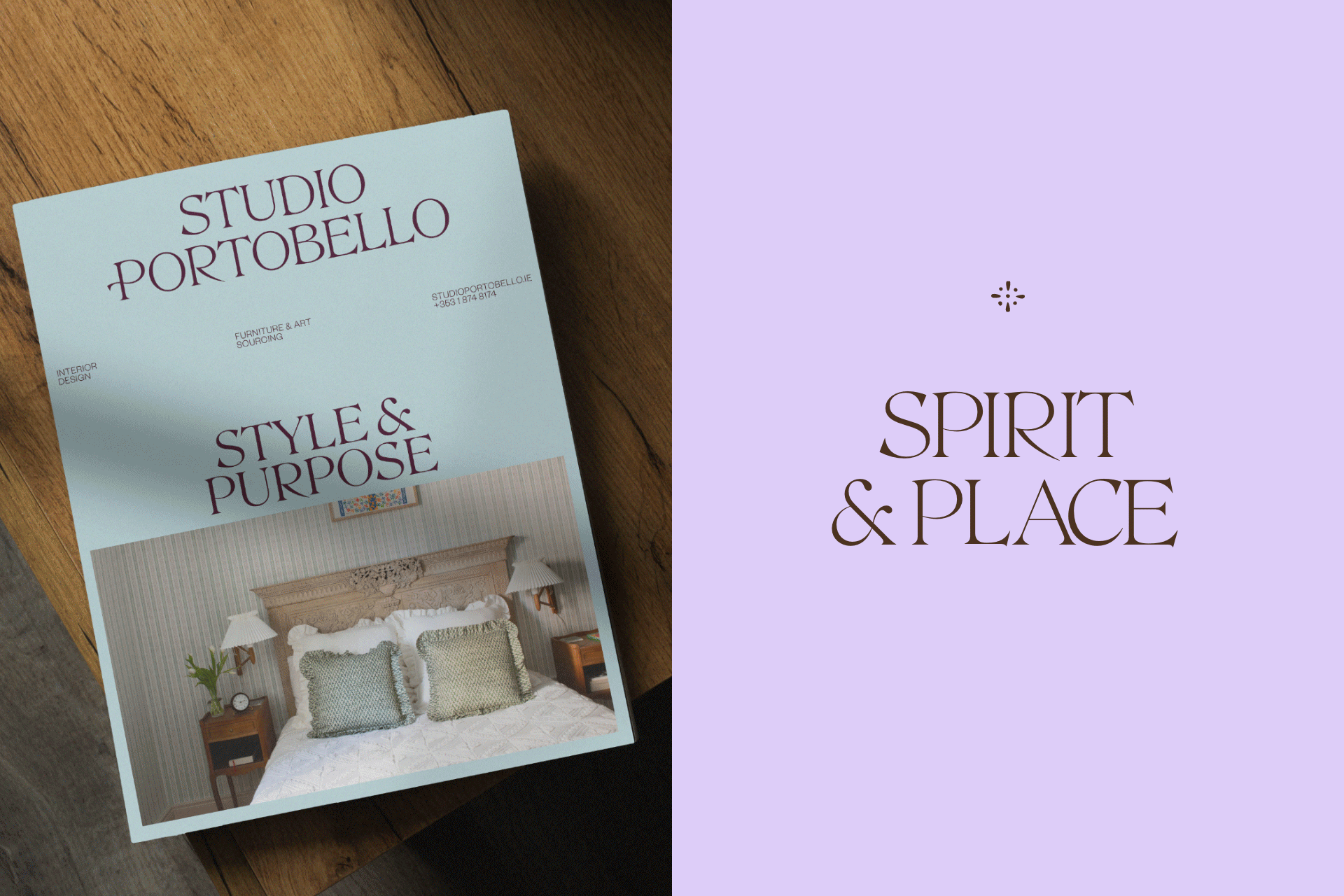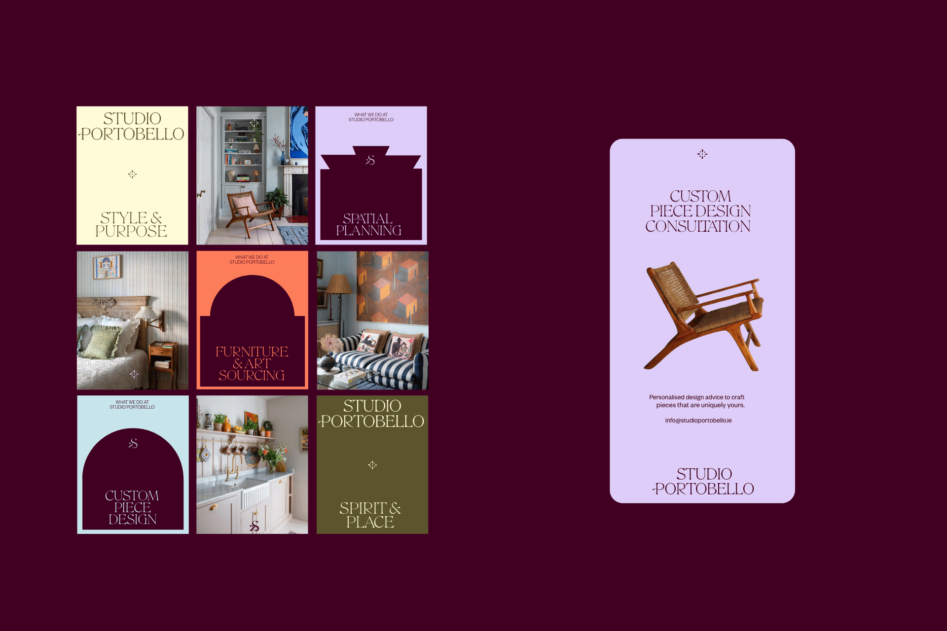 Building on the SP initials, we explored paired phrases such as Style & Purpose and Spirit & Place to articulate the studio’s ethos: interiors that are both expressive and intentional. From this, we developed a suite of architectural forms inspired directly by Studio Portobello’s physical interiors. These shapes act as visual signifiers for the studio’s services – from spatial planning to sourcing and custom design – grounding the identity in the language of rooms, thresholds and objects rather than abstract graphics.