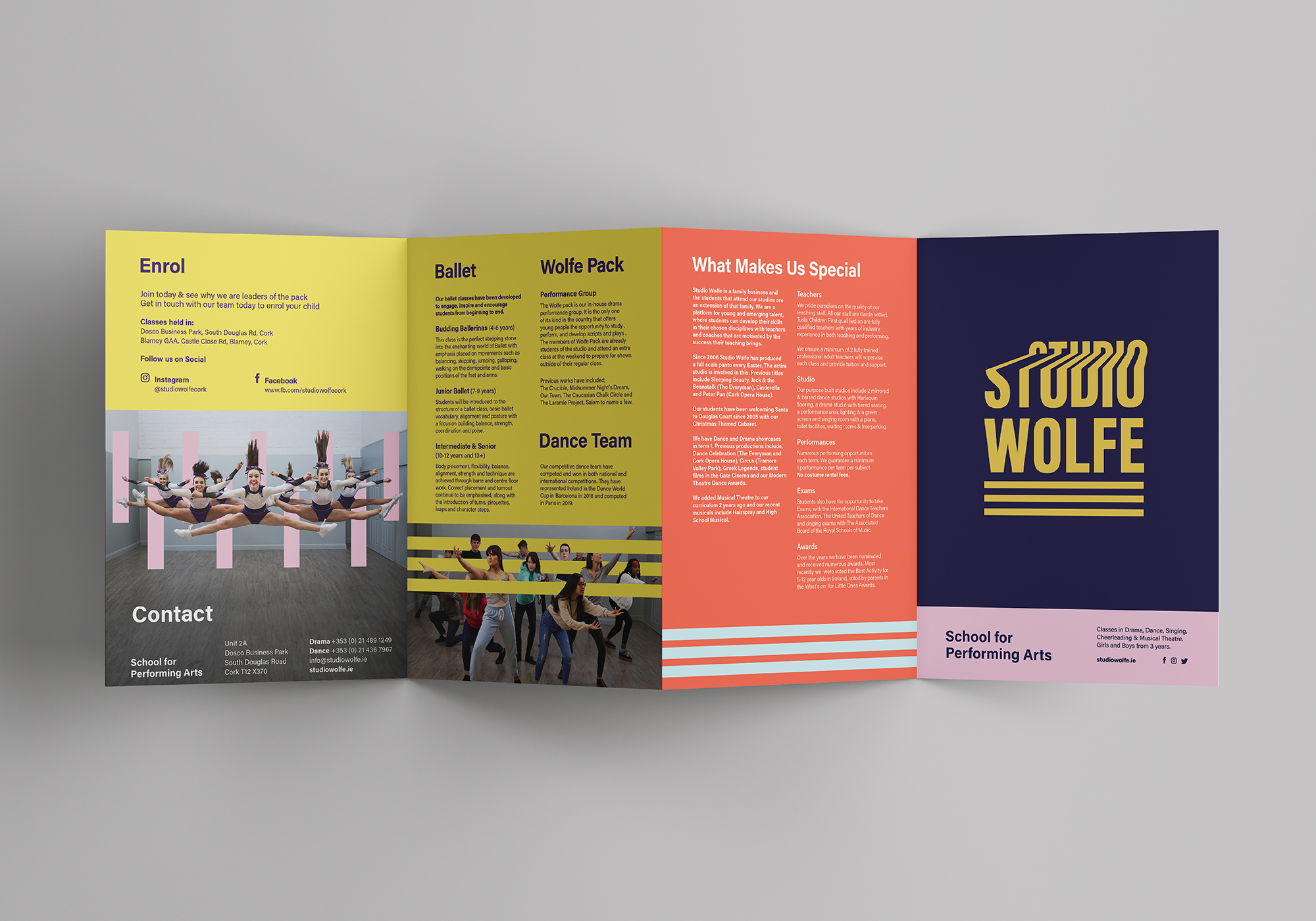 Previously called Wolfe Stage School, we worked with Declan and Careen on a name that was relevant to their current operations and ethos. A studio is a room or place for instruction or experimentation. Studio Wolfe focuses on the process of learning rather than a finished product. It is a place where children of all levels can participate. Our new name reflects this concept of ‘method’.