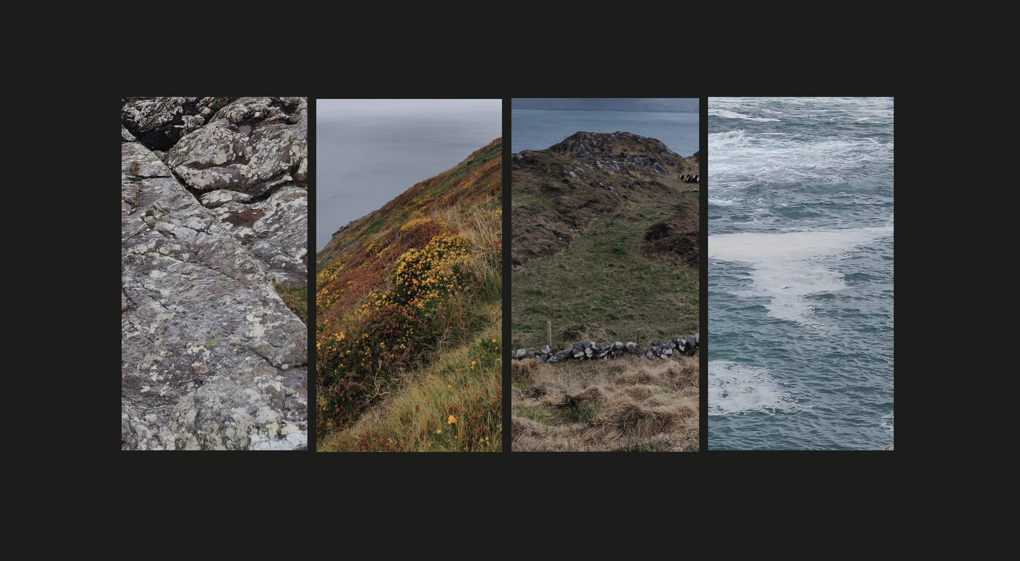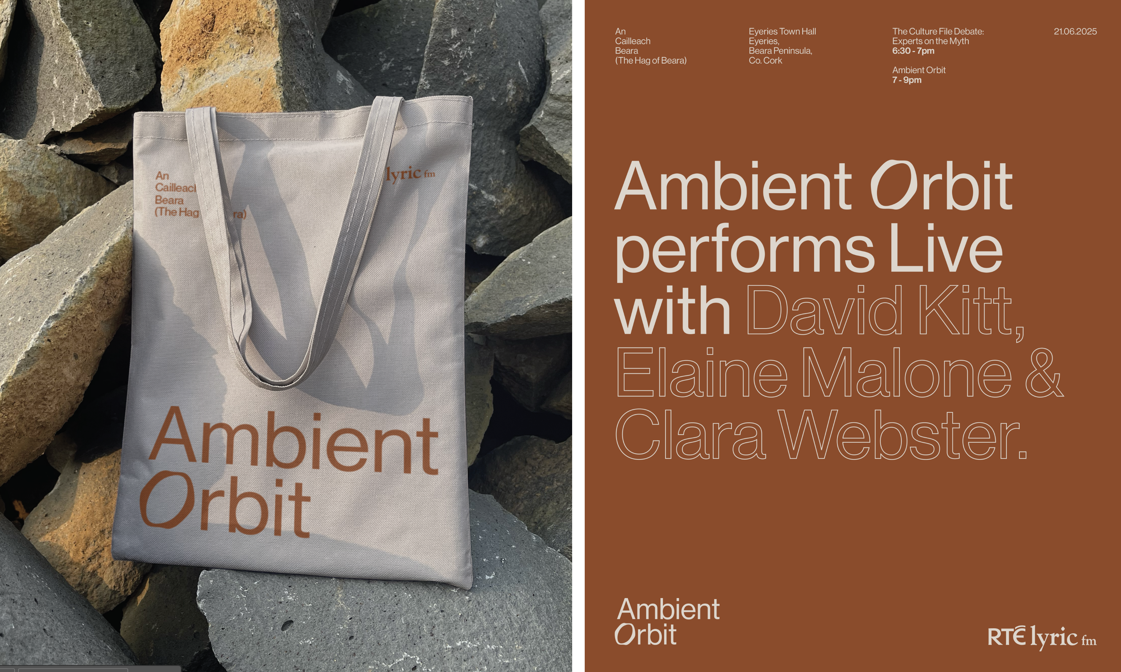 The Summer Solstice event, broadcast live from Eyeries Town Hall, is reflected visually through a calm, restrained design system that mirrors the ethos of the programme itself. Earth-toned colour palettes, soft typographic contrasts, and expansive landscape photography evoke the coastal environment of West Cork. The design allows image and text to breathe, echoing the spaciousness of ambient sound, while subtle shifts in colour and layout suggest the passage of time and changing light across the solstice evening. Together, the design and broadcast form a unified sensory experience, quiet, grounded, and deeply connected to place.