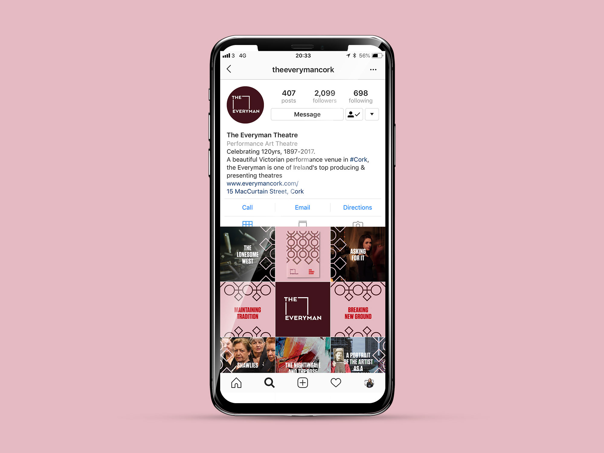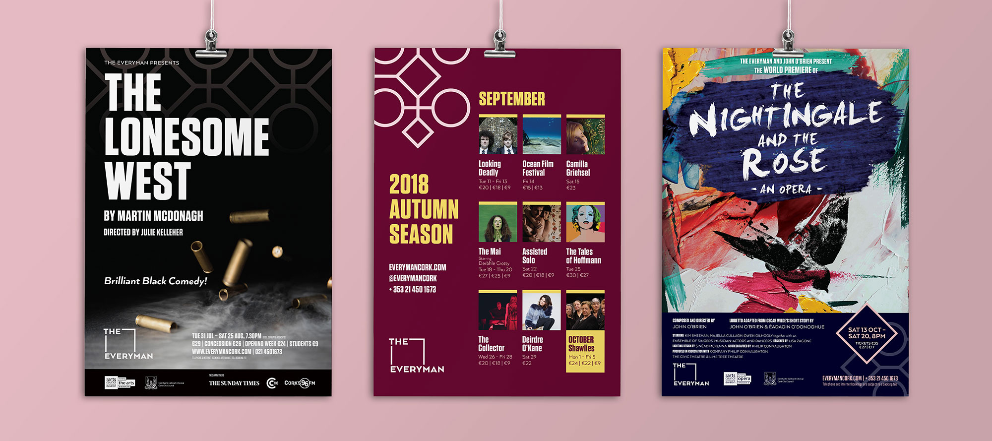 The Everyman Theatre is a 650-seat Victorian theatre on MacCurtain Street in Cork, Ireland. Originally opened in 1897, it is the oldest purpose-built theatre building in Cork. The Everyman has undergone many changes in its time: once a cinema, had periods of disrepair, and redevelopment as a modern theatre in the 1990s.The theatre is housed in a listed (protected) Victorian building with a large stage and auditorium, with proscenium arch, four elaborately decorated boxes, a studio space and a bar. In 2018, the everyman decided it was time to modernise the brand and visual identity of the theatre while preserving its incredible elegance. The goal was to create a place fo every man, every woman, every show, every artist, everyone could meet and immerse themselves in the world of the Arts. A place where they felt they belonged.