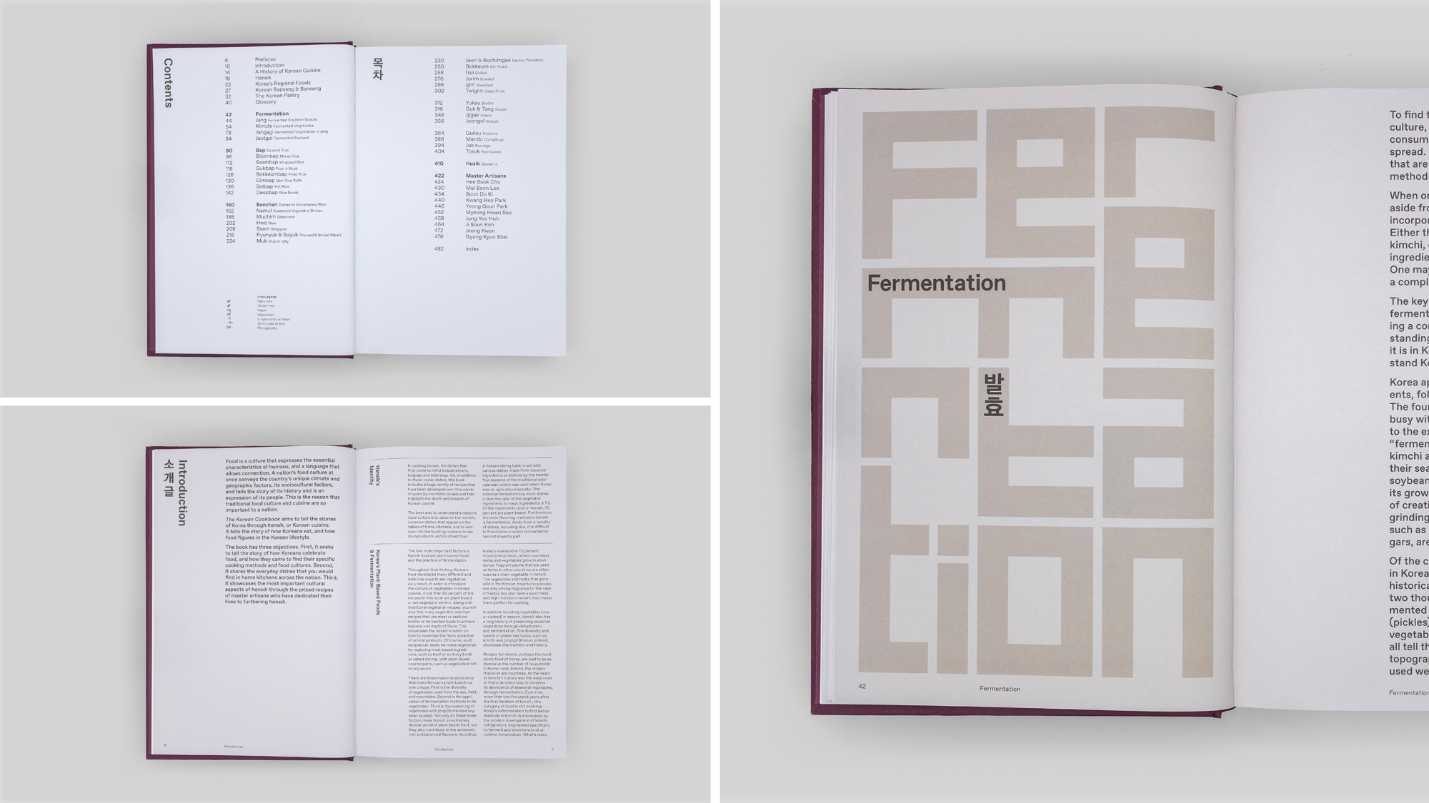 Our design solution drew inspiration from Ahn Sang-soo's prolific typeface, AG Ahnsangsoo 2012, this created the foundations of our visual language that we developed into modular lockups that are a visual nod to traditional Korean door patterns. The hardcover is wrapped in Hanji paper and the color draws from the South Korean flag blending red and blue together symbolic of all the regions' recipes coming together. Every design decision, from the vertical custom type on the cover to the paper, and section dividers, is rooted in Korean culture.