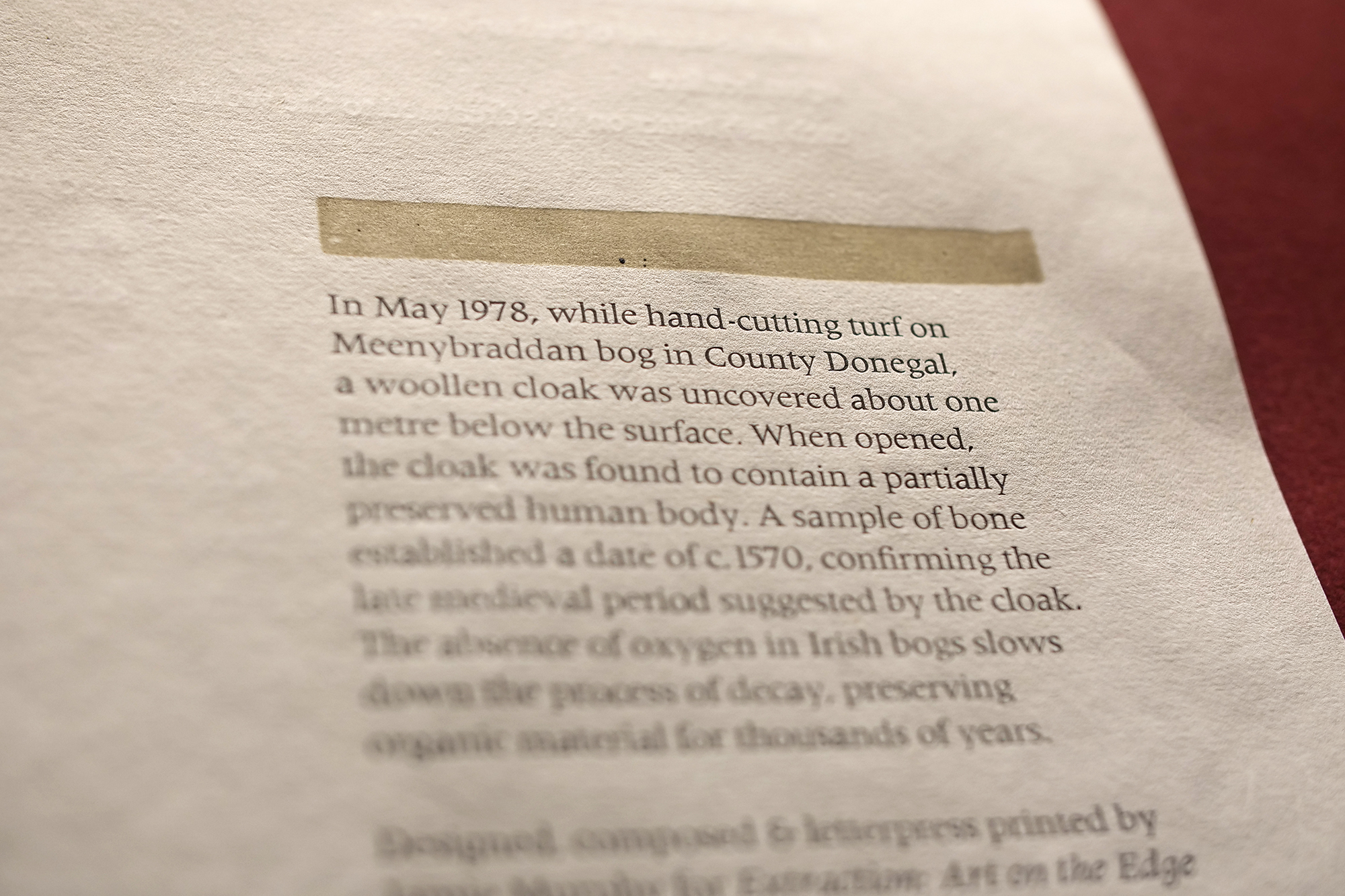 In May 1978, while hand-cutting turf on Meenybraddan bog in County Donegal, a woollen cloak was uncovered about one metre below the surface. When opened, the cloak was found to contain a partially preserved human body. A sample of bone established a date of c.1570, confirming the late medieval period suggested by the cloak. The absence of oxygen in Irish bogs slows down the process of decay, preserving organic material for thousands of years.