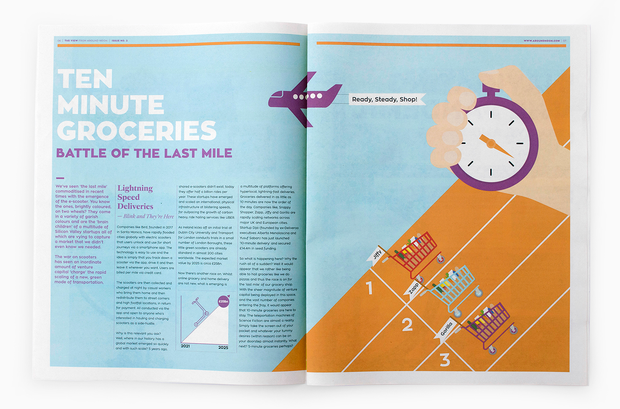 The View is a seasonal promotional publication produced by Around Noon, one of the UK and Ireland’s leading food-to-go manufacturers. The publication, printed in newspaper format, is sent out to their customer base and features insights and opinion pieces about what’s happening in the industry and beyond. We design the publication using illustrations and infographics to help bring the content to life and make it an engaging read for anyone who's desk it lands on.