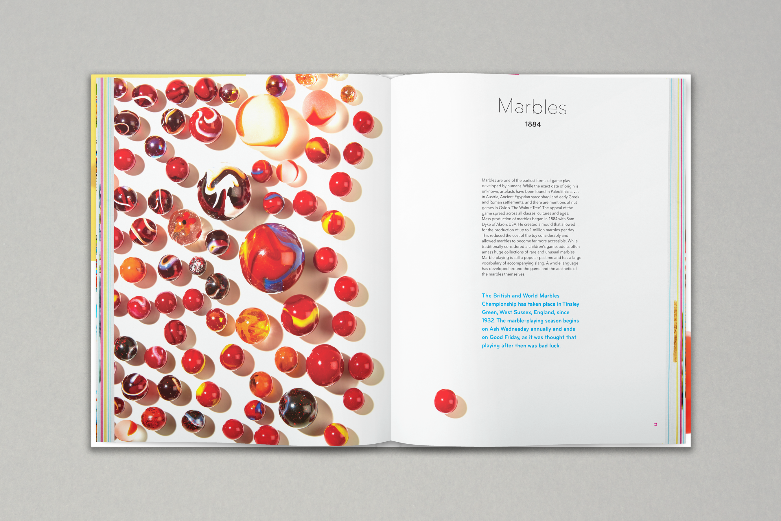 The photography mostly spans over full spreads to further encourage a state of nostalgia. Particularly iconic toys were shot on coloured paper, which we shadowed through the colour palette of the text and endpapers.