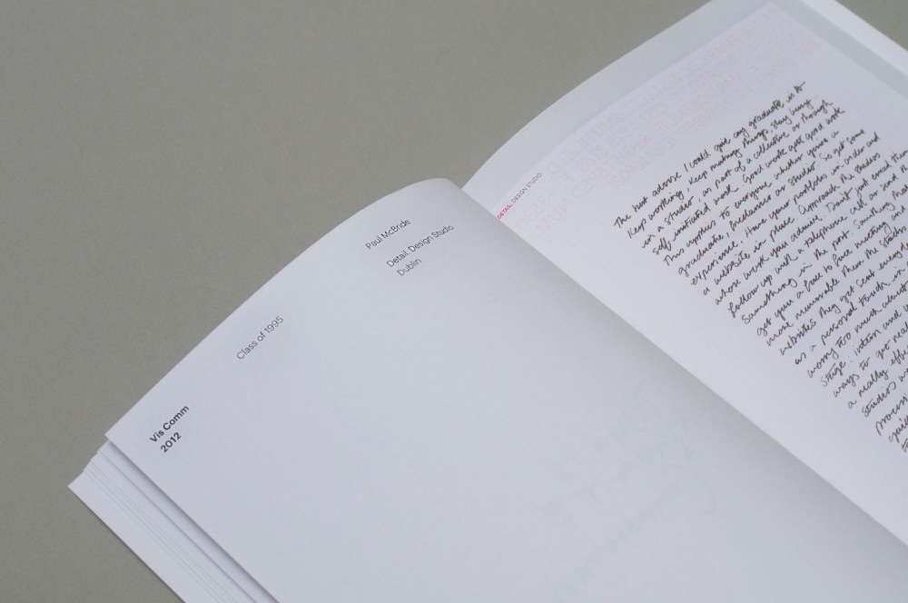 The second element, the catalogue, was made up of two parts. The first section comprises of a collection of letters from past graduates of the course offering words of wisdom, memories and advice to us, the graduates. The second section forms an index of each of the soon-to-be graduates including an overview of their work along with a brief description of their final projects and contact details.