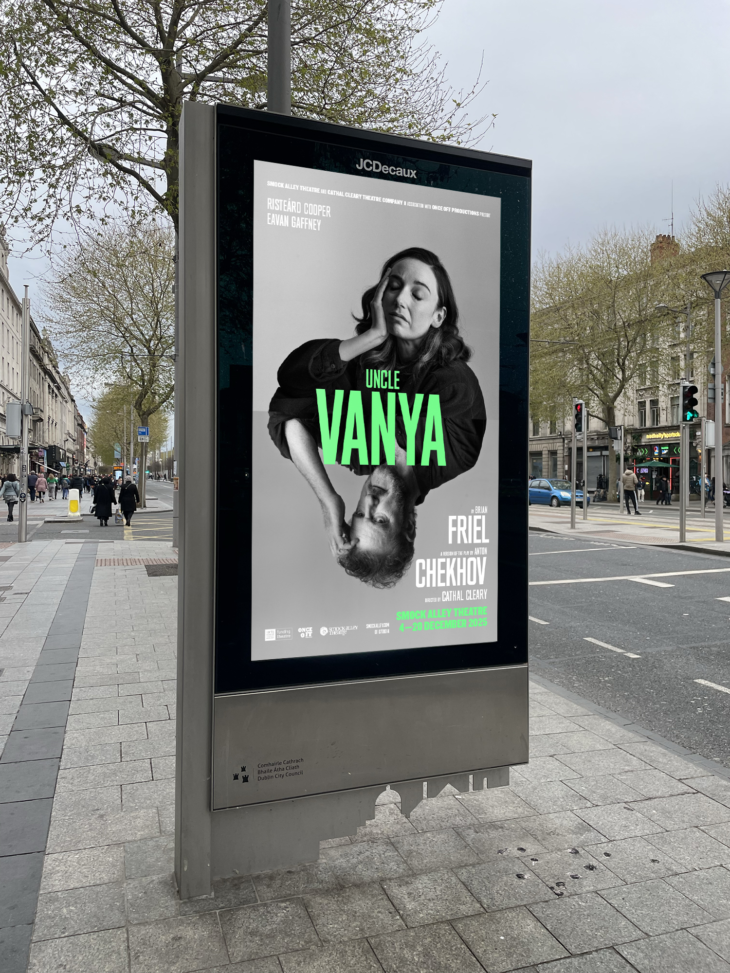 A minimal approach combining clean typography, strong photography, and one vivid colour. Reflection becomes the central motif, with the image rotated in multiple variations to mirror the play’s themes.