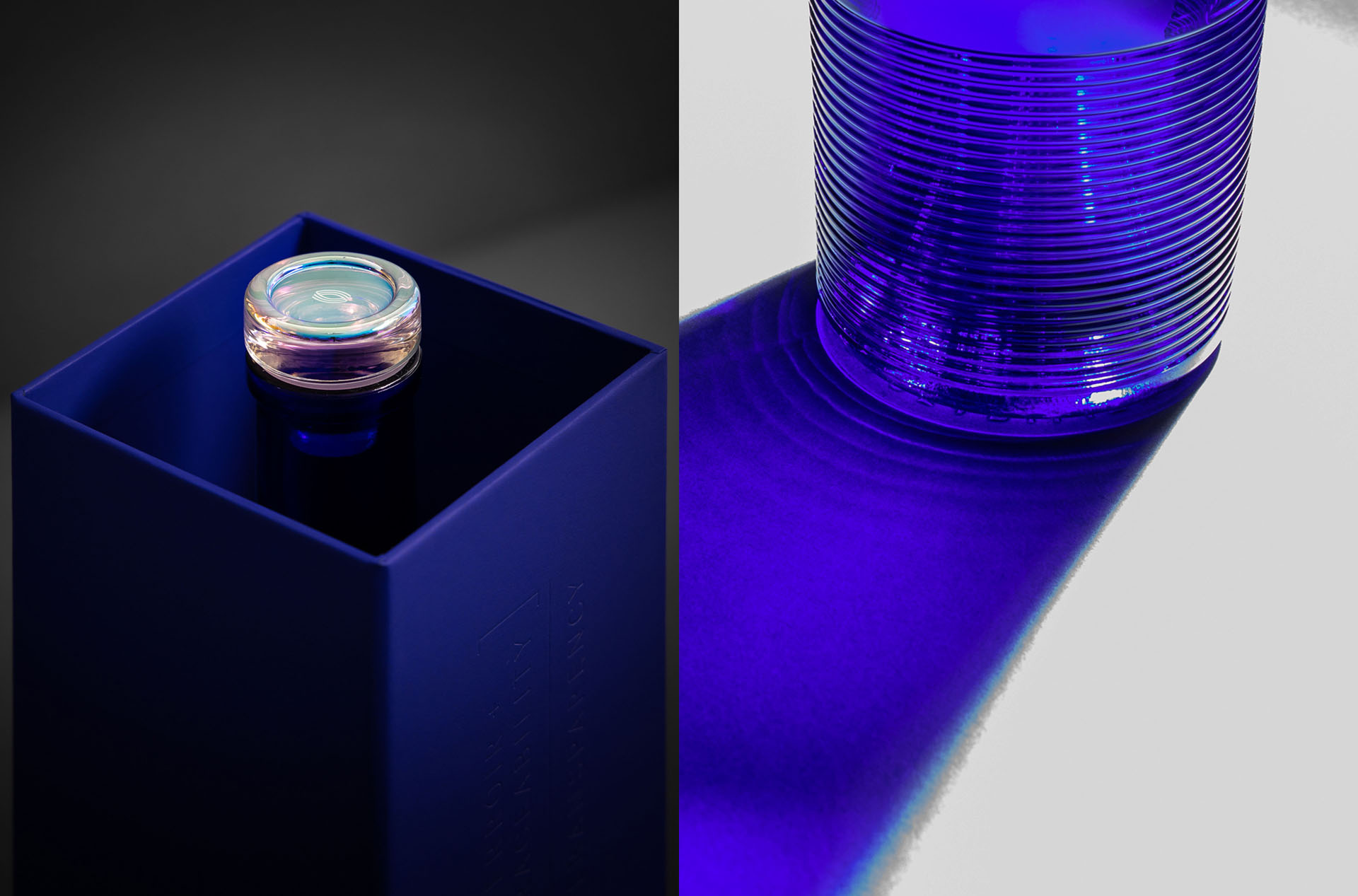 The bottle design challenge was to make something unique and practical - with the eye on creating an iconic classic. We were inspired by blue glass bottles once traded on the quays in Waterford and the contours on the bottom of the glass were inspired from the corrugated ridges on the distillery building itself. The deep connection this whisky has to nature and barley informed the symbols. Concentric circles represent the multiple barley farms intersecting with the solid circle; earth. Where they intersect creates the ‘hidden’ shape of a seed of barley. The glass stoppers were chosen as a more reliable and cleaner option to traditional corks. Foiling and embossing are used to add layers of depth and tactility. The majority of these bottles were bought for collections where the box and bottle are proudly displayed together. The final product avoided the use of plastic and specified FSC boards and papers throughout. We delivered the full brand Identity system, bottle design, and packaging design.