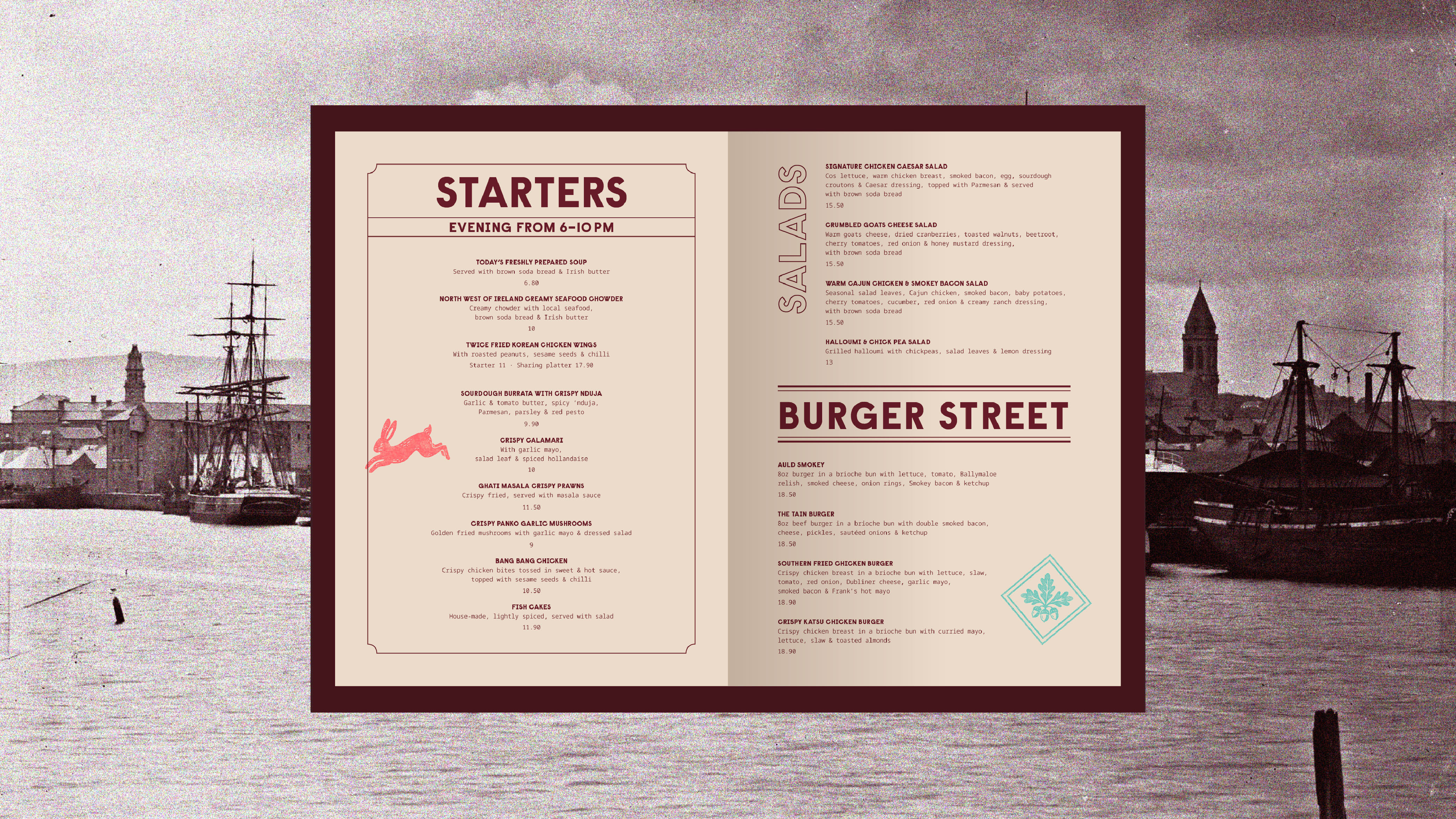 To help tell the story, we developed a series of custom block-print-style stamp illustrations inspired by Sligo’s trading past. Each stamp captures a small piece of local history, appearing across menus, posters and social content, quietly reinforcing the narrative while doing a bit of visual heavy lifting.