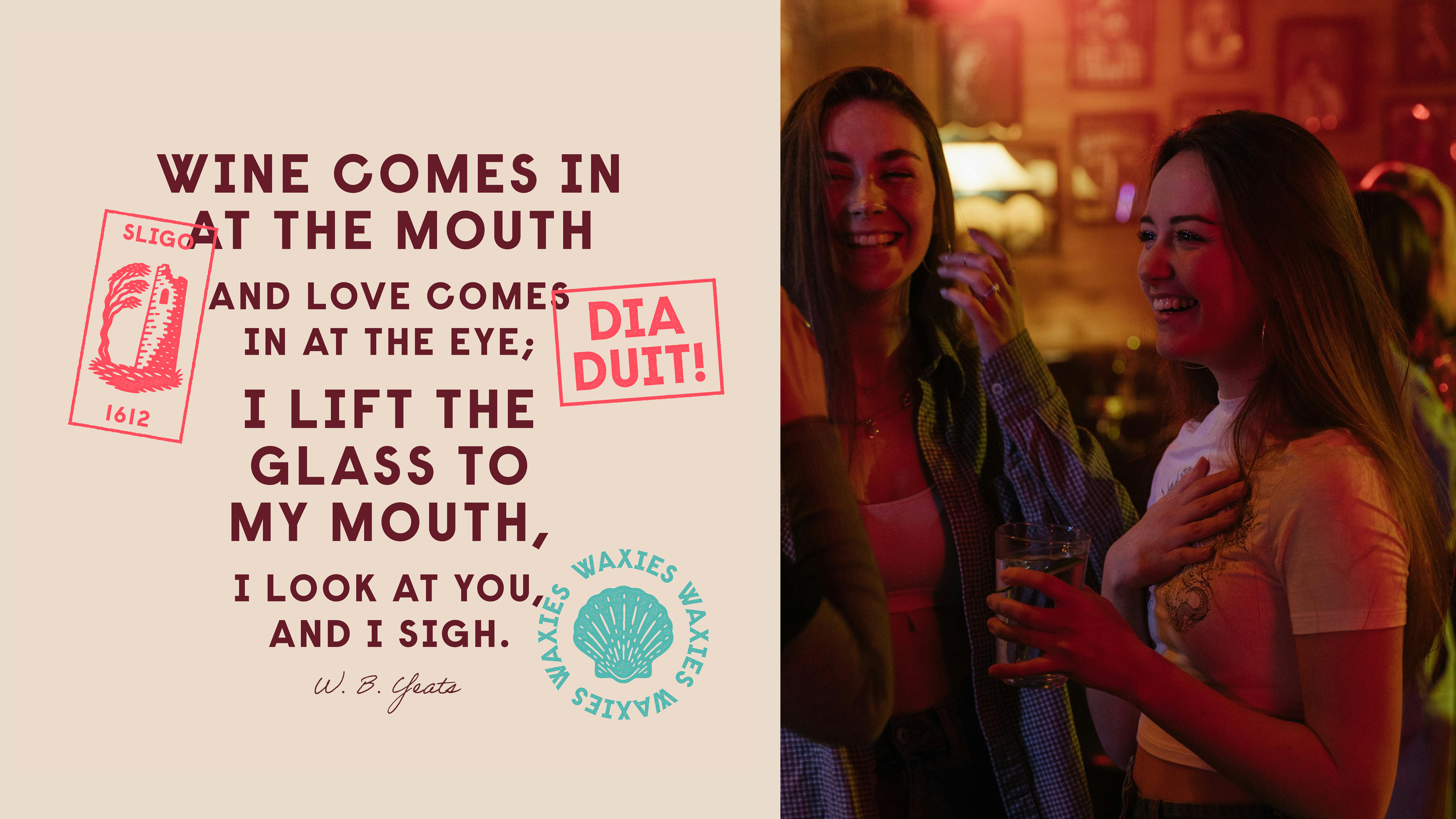 Waxies is conceived as a space that feels genuine and lived-in, rich with atmosphere (and plenty of craic). The brand carries Sligo’s past forward through considered texture, tone and detail, while staying firmly rooted in the here and now. Drawing on the character of the traditional Irish pub, we crafted a visual language refined enough to work across signage, menus and social platforms, but bold enough to hold its own in a busy night-time landscape.