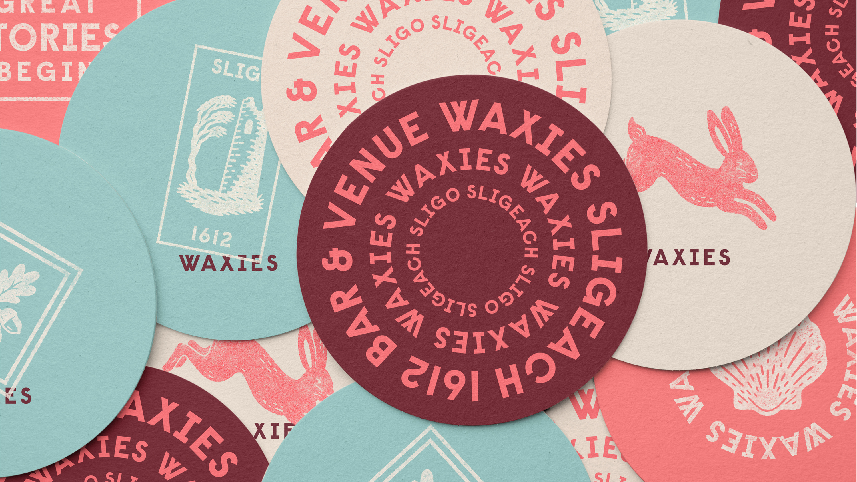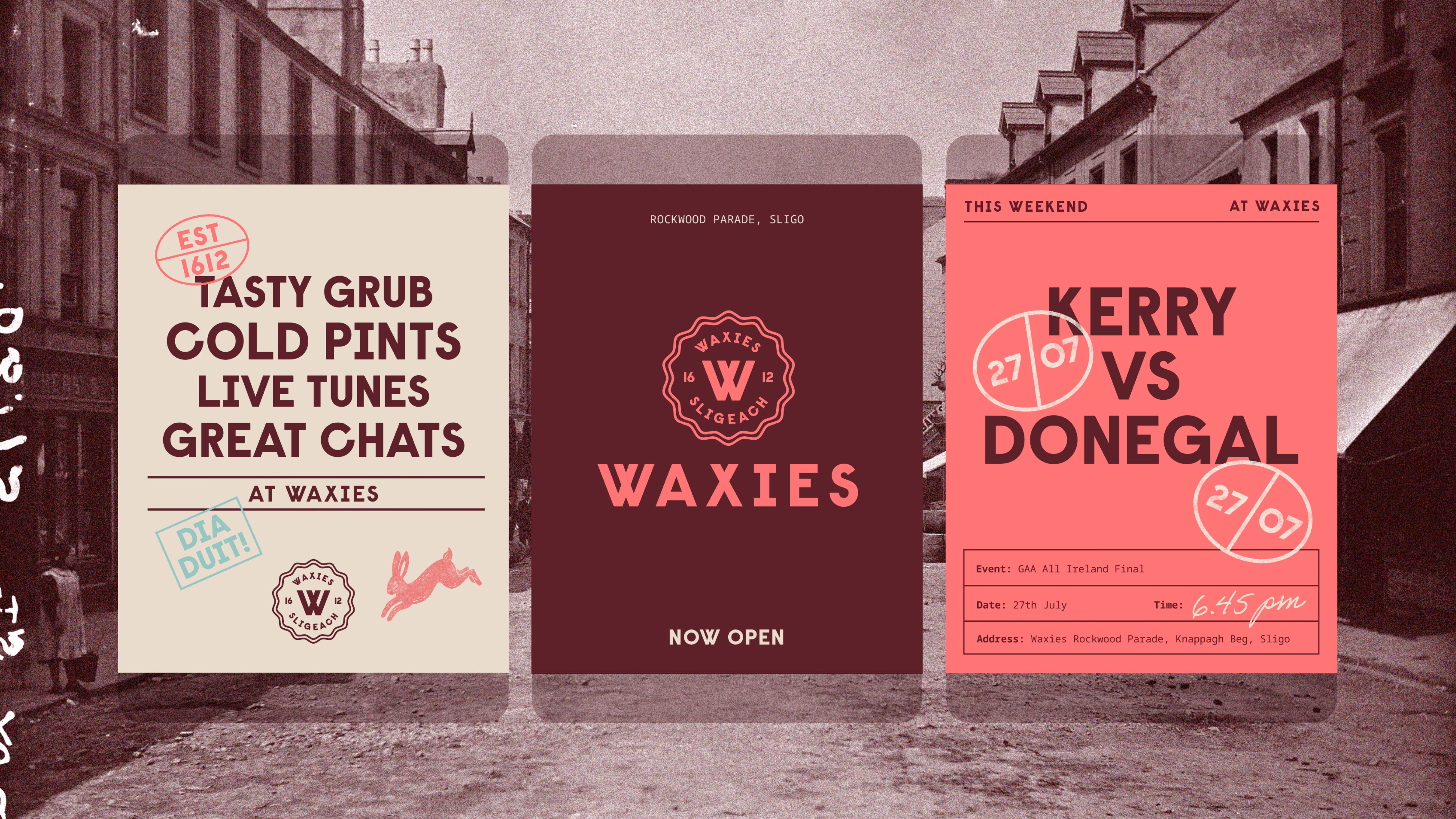 Vintage-style layout grids and paper textures reference historical documents and ledgers, grounding the identity in Sligo’s merchant heritage. Every touchpoint was designed to make Waxies feel local, confident and full of character, the kind of place that feels like it’s always been there, even if it hasn’t.