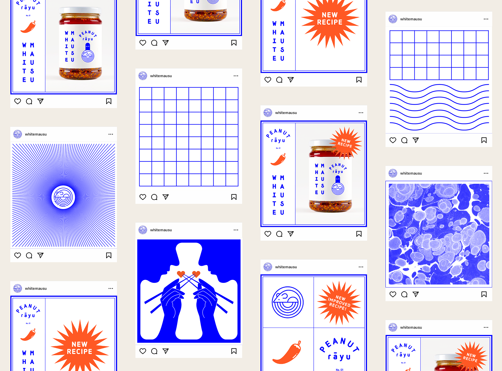 When White Mausu approached us seeking to update and revitalise their already impressive brand identity for the changing times, they had pinpointed certain aspects that were outdated, less effective, or unnecessary. Our challenge was to conscientiously propel it forward; aligning it with the evolution of the food company and their array of new flavours, ensuring its relevance for the future, all the while preserving the brand’s integrity and value. The objective was to develop their identity through a comprehensive set of new logos, labels, merchandise, social media assets and more to come that will harmonise their overall output.