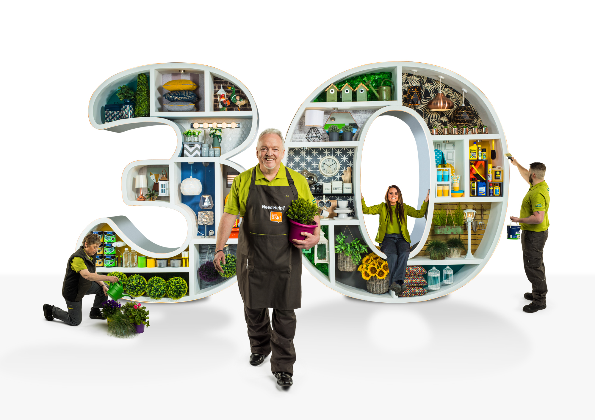 We wanted the diversity of Woodie’s experience to come across in their mark. Our approach was to celebrate the people and products that make Woodie's wonderful. We took a little licence and 'dipped' the 30 mark into a range of product categories; paint, plants, garden, barbecue, etc. and coupled it with playful copy such as 'Blooming for 30 years'. We even brought a fresh look to their uniforms. We went a step further with ‘The Big 30’ brand campaign, a totem to centre the year’s celebrations around. This was quite literally 'made of Woodie's'. We physically built a giant ‘30’ to showcase their products and to make the thirty year brand come to life. The documentation of its design and construction and the Woodie’s staff participation in that process allowed us to tell the story of an Irish brand that has built a community of colleagues and customers that appreciate what it means to be experts in DIY.